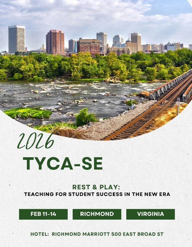 The 2026 TYCA-SE Conference, held Feb 11-14 in Richmond, VA, invites sessions that explore strategies, ideas, and manifestos for teaching two-year college writing and literature that connect rest and play for improved student outcomes as well as strategies for creating and sustaining community among educators. For example, we invite session proposals about